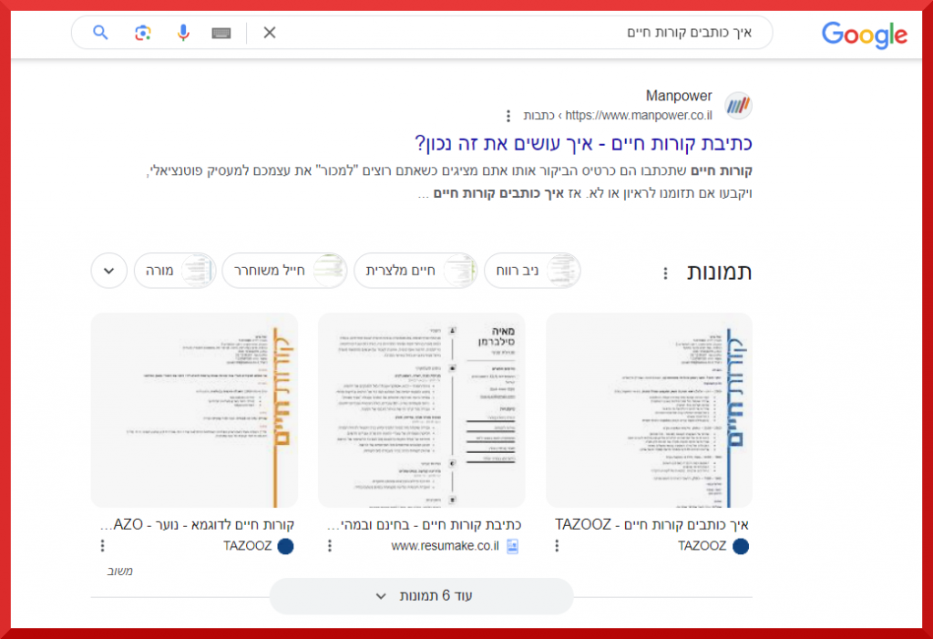 כדי להדגים את זה, אני אציג את החיפוש של "איך כותבים קורות חיים". אחרי שתי מודעות (שלא תמיד מופיעות) ושתי תוצאות אורגניות רגילות, גוגל כבר מזדרז להציג תמונות.