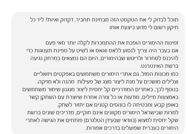 1.הגהה ו"שיוף" של התוכן: עם כלים כמו ChatGPT קל מאוד לקחת תוכן קיים, לבצע לו הגהה ואפילו לבדוק טעויות עובדתיות או משפטים לא ברורים לרמת הידע של מי שקורה את המאמר.